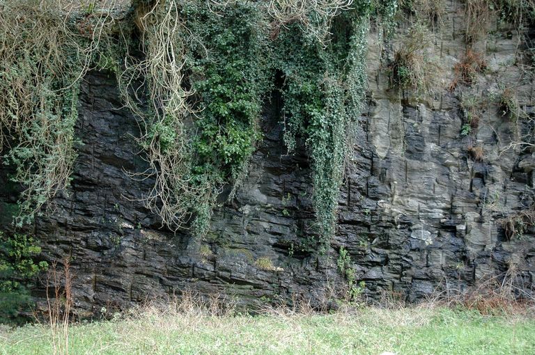 Vue des vestiges des fortifications d'agglomération de Brest : fossé sec au Moulin à poudre, traces de déroctage à la mineImmatriculation