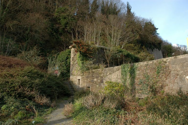 Vue des vestiges des fortifications d'agglomération de Brest au Moulin à poudre : mur défensif percé de créneaux de mousquetterie de la porte de la BrasserieImmatriculation