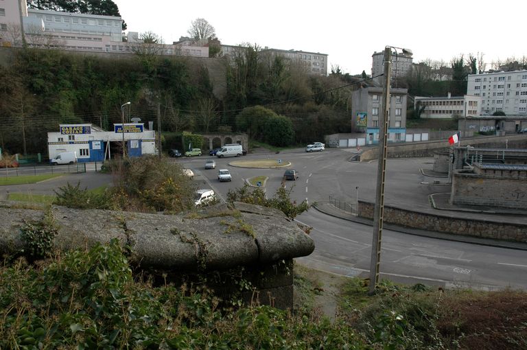 Vue des vestiges des fortifications d'agglomération de Brest au Moulin à poudre : mur défensif percé de créneaux de mousquetterie de la porte de la BrasserieImmatriculation