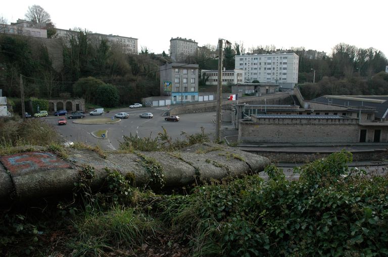 Vue des vestiges des fortifications d'agglomération de Brest au Moulin à poudre : mur défensif percé de créneaux de mousquetterie de la porte de la BrasserieImmatriculation