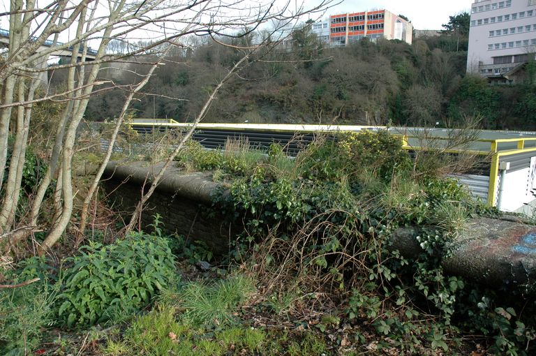 Vue des vestiges des fortifications d'agglomération de Brest au Moulin à poudre : mur défensif percé de créneaux de mousquetterie de la porte de la BrasserieImmatriculation