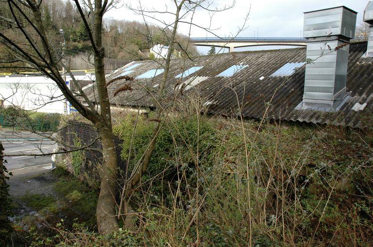 Vue des vestiges des fortifications d'agglomération de Brest au Moulin à poudre : mur défensif percé de créneaux de mousquetterie de la porte de la BrasserieImmatriculation