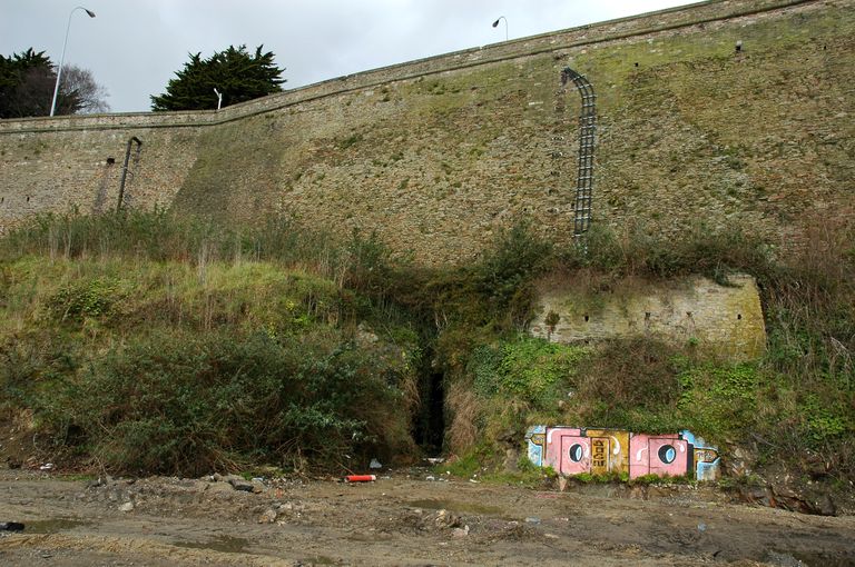 Vue des vestiges des fortifications d'agglomération de Brest : front bastionné du Cours Dajot. Entrée du tunnel allemand servant d'hôpital militaire aménagé sous la rampe construite durant le Second Empire pour le Port de Commerce de PorstreinImmatriculation