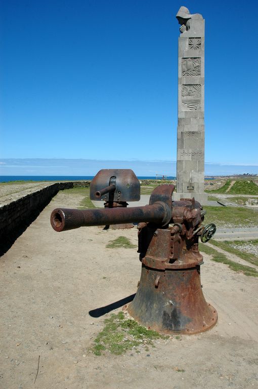 Vue des deux canons de 95 mm Lahitolle modèle 1888 sur leur affût avec masque. A l'arrière, le monument aux marinsImmatriculation