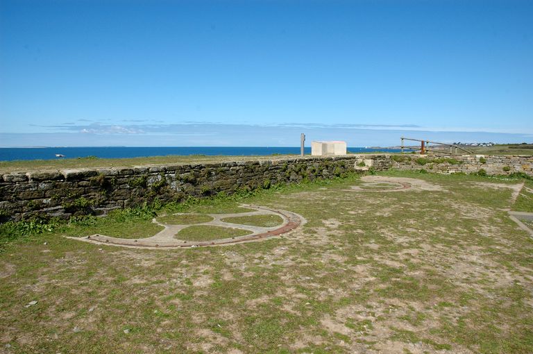 Vue de la batterie d'artillerie de côte et de sa plate-forme : emplacement des sellettes d’affût en demi-cercle reposant sur du béton pour les deux canons de 90 mm du poste de défense contre les sous-marinsImmatriculation