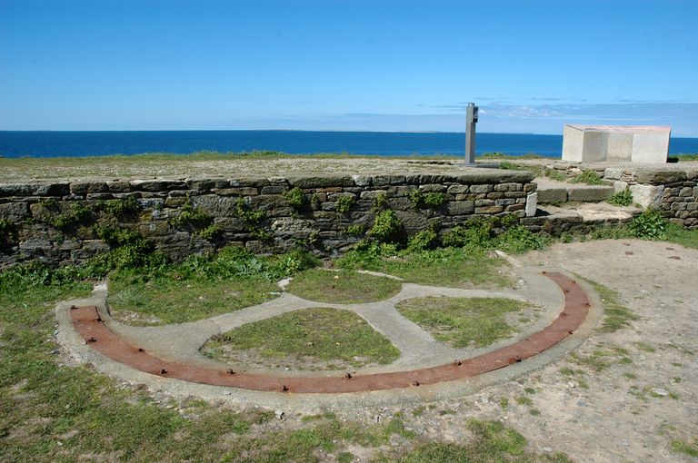 Vue de la batterie d'artillerie de côte et de sa plate-forme : emplacement de l'une des deux sellettes d’affût en demi-cercle reposant sur du béton pour un canon de 90 mm du poste de défense contre les sous-marinsImmatriculation