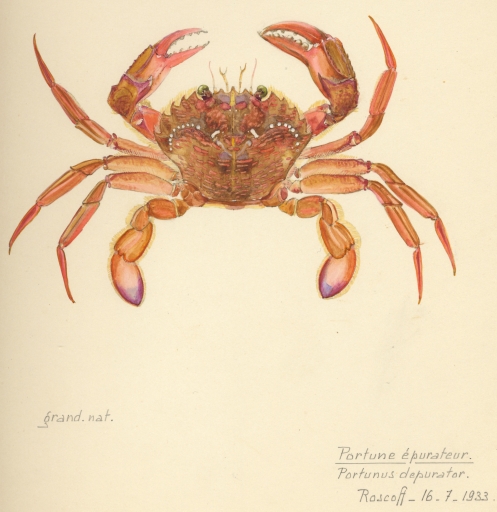 Portune épurateur (Etude sur les crustacés. Parasitisme et symbiose). Aquarelle de Paul Cordonnier, 1937Immatriculation