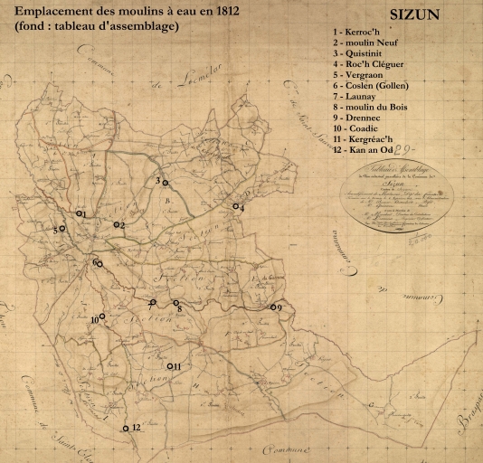 Localisation des moulins sur le tableau d'assemblage de 1812 (A.D. Finistère, 3 P 279)Immatriculation