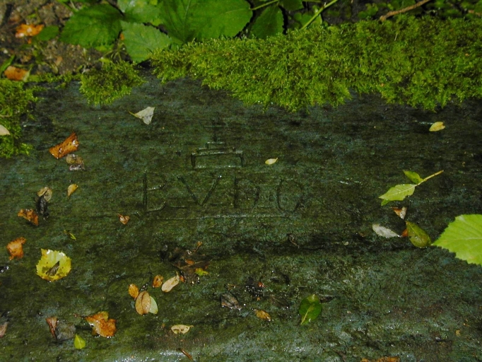 Kerambloch : ancien bassin, dalle de schiste, détail du décor gravéImmatriculation
