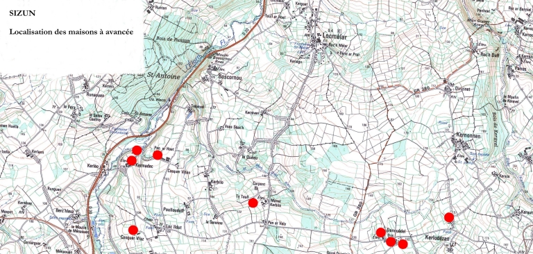 Les maisons, fermes et hameaux sur la commune de Sizun,