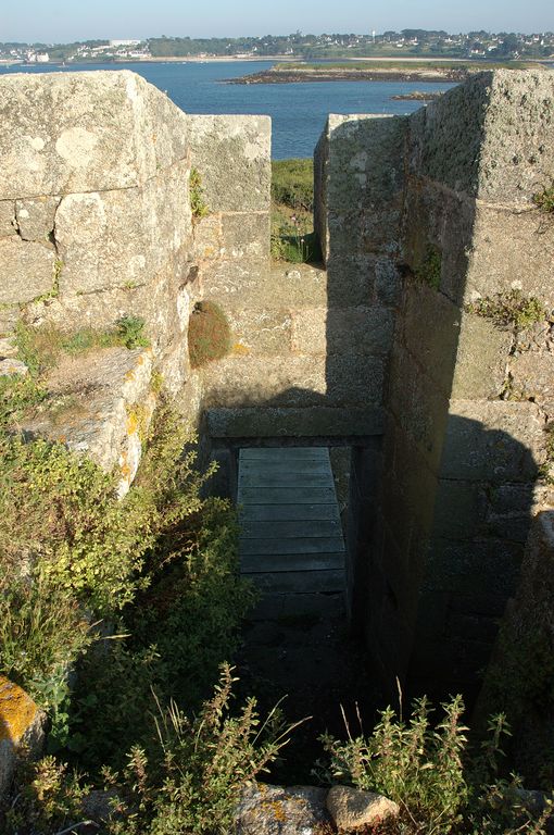 Vue de la tour d'artillerie du fort Cézon : dispositif d'entrée, pont-levis à contrepoids, chicane, assomoir. En cas de prise du fort, la tour d'artillerie constitue un ultime réduit défensifImmatriculation