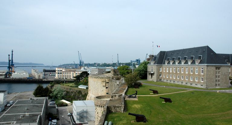 Vue générale : tour du Moulin, tour Française et préfecture maritime. En arrière-plan : l'arsenal et le goulet de BrestImmatriculation