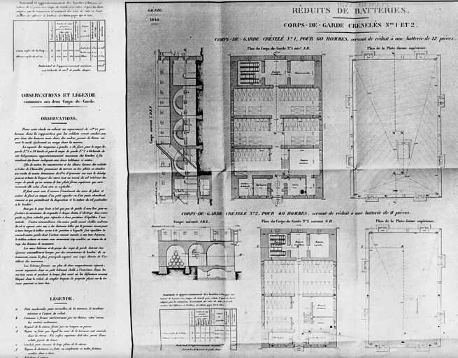 Plans, coupes et profils des réduits de batteries : corps de garde crénelés n° 1 (pour 60 hommes, servant de réduit à une batterie de 12 pièces) et n° 2 (pour 40 hommes, servant de réduit à une batterie de 8 pièces), 1846Immatriculation
