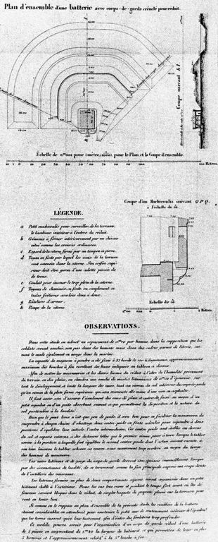 Plans, coupes, et élévations des réduits de batteries : corps de garde crénelé n° 3 pour 20 hommes servant de réduit à une batterie de 4 pièces, 1846, détail, plan d'ensemble, légende et observationsImmatriculation