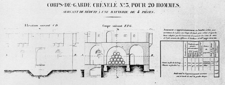 Plans, coupes, et élévation des réduits de batteries : corps de garde crénelé n° 3 pour 20 hommes servant de réduit à une batterie de 4 pièces, 1846, détail, armement et approvisionnement des bouches à feuImmatriculation