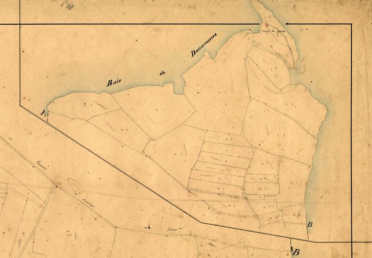 Plan de situation de la batterie et du corps de garde de Beg an Ty Garde, 1851, extrait du cadastre ancien de la commune de Plonévez-Porzay (Archives Départementales, Finistère, 3P239_017)Immatriculation