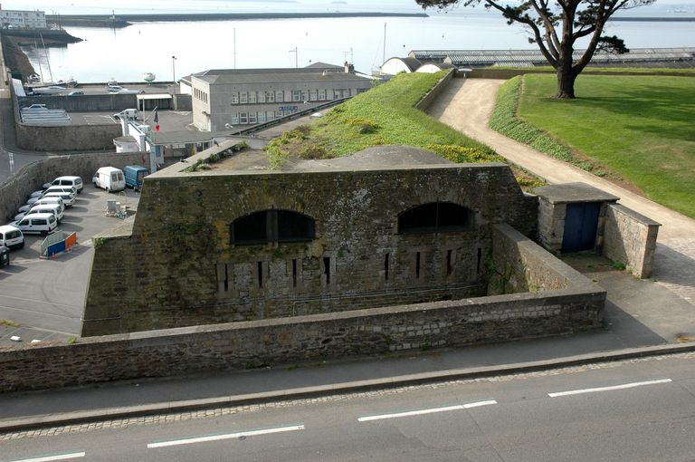 Vue des vestiges des fortifications d'agglomération de Brest : corps de garde percé de créneaux de fusillade flanquant la porte du Port de Commerce de PorstreinImmatriculation