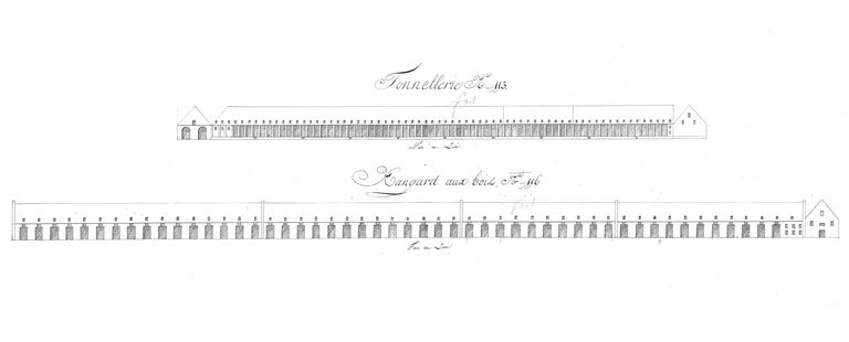 Elévations des établissements maritimes du port de Brest, année 1807. Tonnellerie n° 113. Hangar au bois n° 116Immatriculation