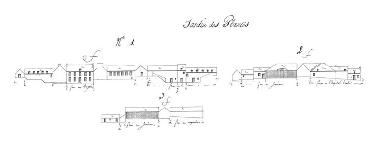 Elévations des établissements maritimes du port de Brest, année 1807. Jardin des Plantes, n° 1 et 2 (face au bagne, face à la cour, face au jardin, face à l'hôpital brûlé, face au rempart)Immatriculation