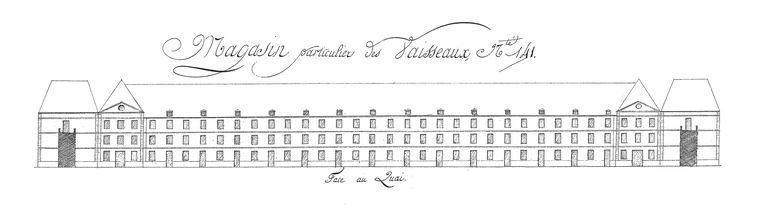 Elévations des établissements maritimes du port de Brest, année 1807. Marine. Magasin particulier des vaisseaux, n° 141 (face au quai) (Note : les façades opposées de ces trois bâtiments n'ont aucune percée)Immatriculation