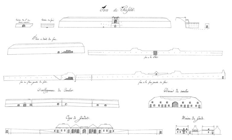 Développements des forts du camp retranché et des batteries de la côte du nord, année 1807. Fort de Penfeld. Traverses du chemin couvert et du fossé. Coupe du pont-levis. Développement et derrière du cavalier. Corps de garde. Maison du gardeImmatriculation