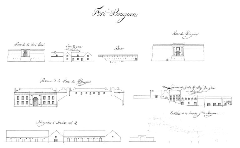 Développements des forts du camp retranché et des batteries de la côte du nord, année 1807. Fort Bouguen. Porte de la demi-lune, corps de garde, pont, porte, bâtiment, logement du garde et magasinier du génie du Bouguen. Magasin à poudre côté QImmatriculation