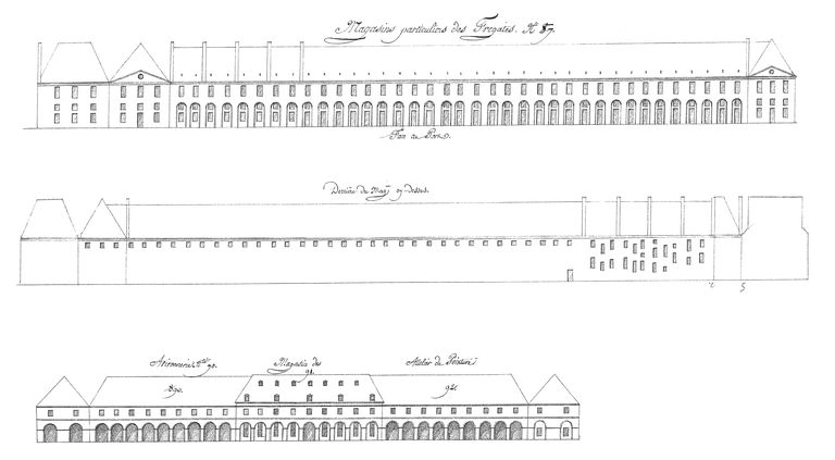 Suite des établissements maritimes, côté de Recouvrance, année 1807. Magasins particuliers des Frégates, n° 87 (face au port, derrière du magasin). Avironnerie, n° 90. Magasins des, n° 91 Ateliers de peinture, n° 92Immatriculation