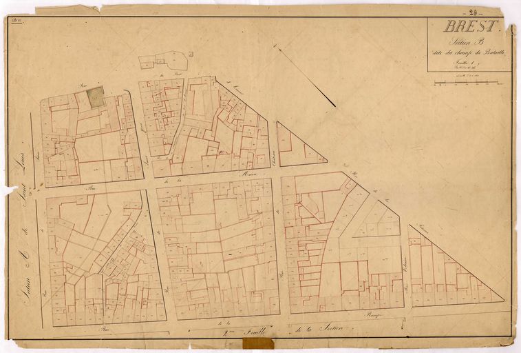 Feuille n° 1 du cadastre ancien de la commune de Brest : section B dite du Champ de Bataille, sans date, 1ère moitié 19e siècle, Archives Départementales du FinistèreImmatriculation