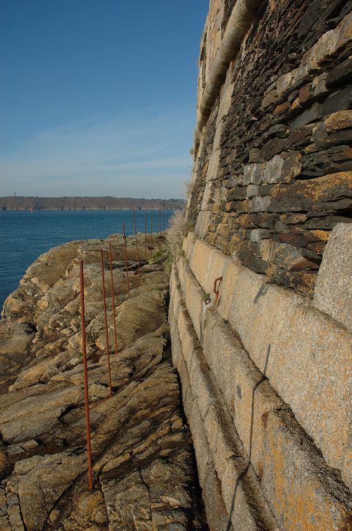 Vue de la batterie de Cornouaille : détail de l'escarpe (mur de soutènement de la batterie). Encadrement des créneaux, et cordon en granite ; remplissage en moellons de schiste (Travaux de stabilisation réalisés par la Direction des Travaux Maritimes)Immatriculation