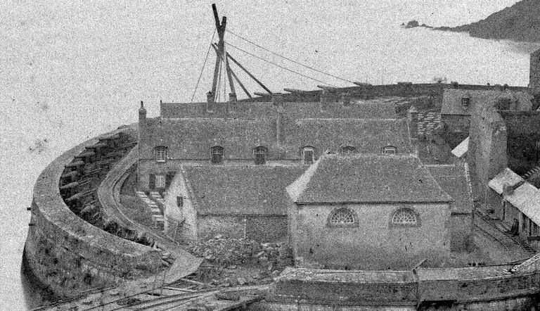 Vue du fort du Mengant en 1877 : détail des casernements et pièces d'artillerie (14 canons de 30 livres modèle 1840 sur affût pivotant et 14 obusiers de 22 cm modèle 1827 sur affût de fer pivotant)Immatriculation