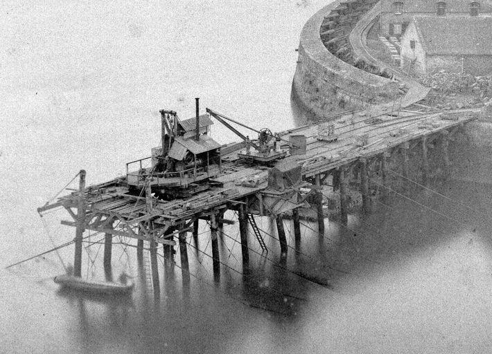 Vue du fort du Mengant en 1877 : détail du chantier de construction du môle d'accostageImmatriculation