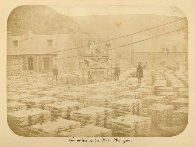 Vue du fort du Mengant en 1877 : chantier de construction du môle d'accostageImmatriculation