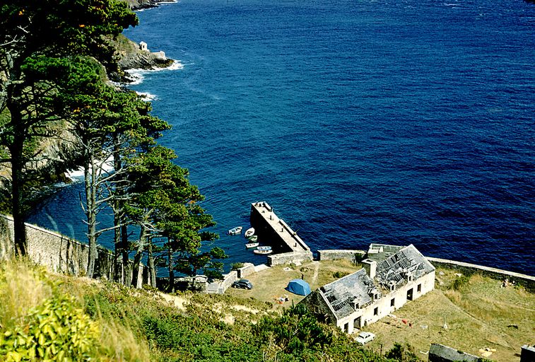 Vue du fort du Mengant et du môle d'accostage vers 1960. On distingue une caserne à la toiture ruinéeImmatriculation