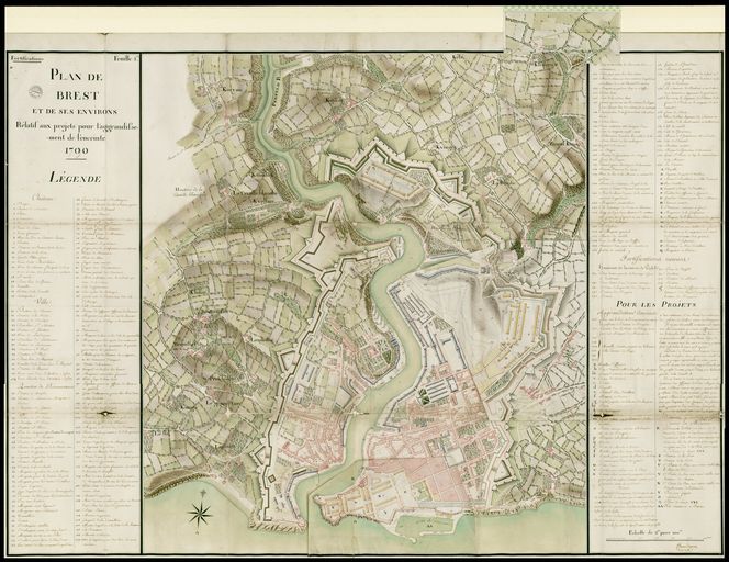 Plan de Brest et de ses environs, relatif aux projets pour l'agrandissement de l'enceinte, 1790 par Jean-Nicolas Desandrouins (ingénieur, directeur à Brest des places de Bretagne)Immatriculation