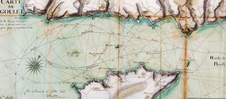 Carte du goulet de Brest, fait à Brest le 15 juillet 1695 par Vauban. A.-B. : étendue de la passe sous le feu des batteries de 5200 toises ou deux bonnes lieues. Service Historique de la Défense, Château de VincennesImmatriculation