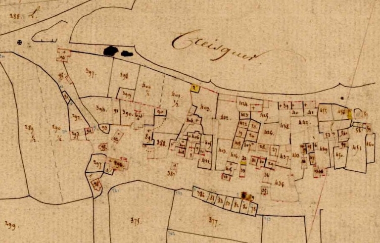 Le village en 1836. Extrait du cadastre de Berrien, section K 1 (A.D. Finistère, 3 P 86)Immatriculation