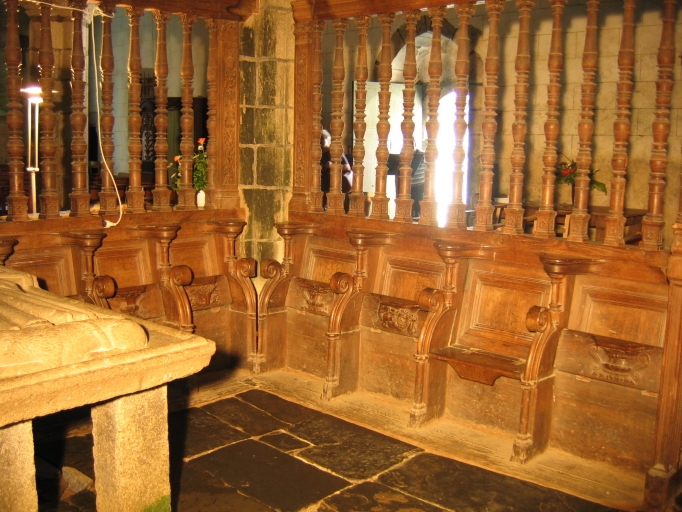 Intérieur du chancel et vue sur les stalles, côté Ouest et Nord. Aperçu d'une partie du tombeau de saint Herbot.Immatriculation