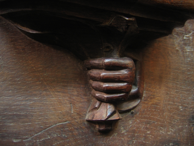 Miséricorde : détail de la main et de l'encoche située au-dessus, élément qui se retrouve de l'autre côté du parcheminImmatriculation