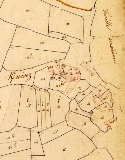 La partie ouest du village en 1836. Extrait du plan cadastral, section B 1 (A.D. Finistère, 3 P 10)Immatriculation