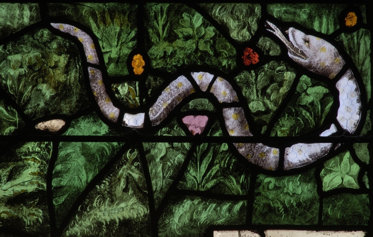 Verrière à personnages de la baie 3 : Paradis terrestre ; Enfance du Christ ; Baptême du Christ,