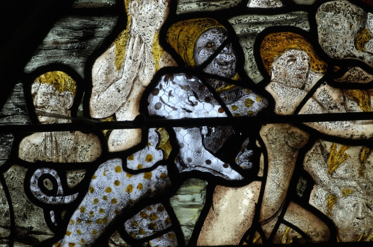 Verrière à personnages de la baie 3 : Paradis terrestre ; Enfance du Christ ; Baptême du Christ,