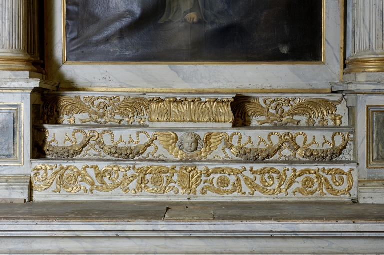 Ensemble de l'autel de la Vierge : autel, retable, 3 gradins d'autel, 2 degrés d'autel,