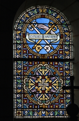 Verrière de la baie 5, symbole de la Pénitence : des clefs croisées au-dessus desquelles s'étend une main pour absoudreImmatriculation