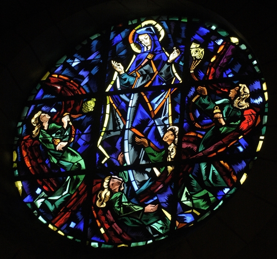 Ensemble des 30 verrières des baies 1 à 16, 18, 103 à 112, 113, 117 : Symboles des sacrements, Symboles des principaux dogmes de l'Eglise,