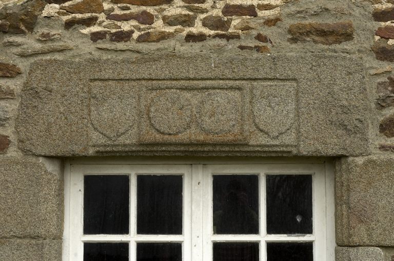 Elévation sud-est du logis : détail des écussons du linteau de la fenêtreImmatriculation
