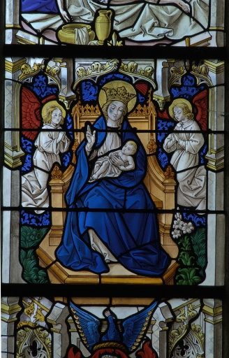 Verrière à personnages de la baie 108 (ancienne maîtresse-vitre) : Passion et Résurrection du Christ, Jugement dernier,