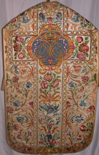 Ornement blanc 1 : chasuble, bourse de corporal, étole, manipule, voile de calice,