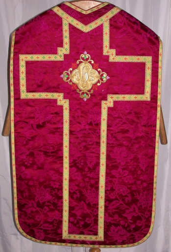 Ornement rouge 4 : chape, chasuble, bourse de corporal, étole, manipule, voile de calice,