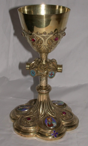 Chapelle d'orfèvrerie : calice, patène, 2 burettes et leur plateau, clochette dans leur boîte,
