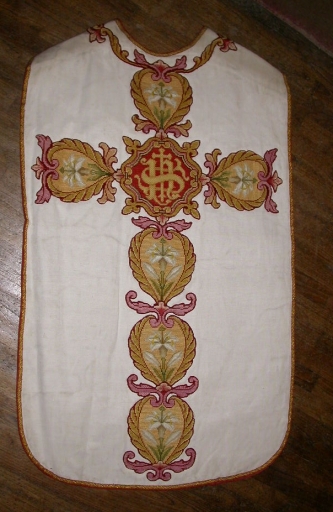 Ornement blanc 2 : chasuble, manipule, voile de calice et bourse de corporal,